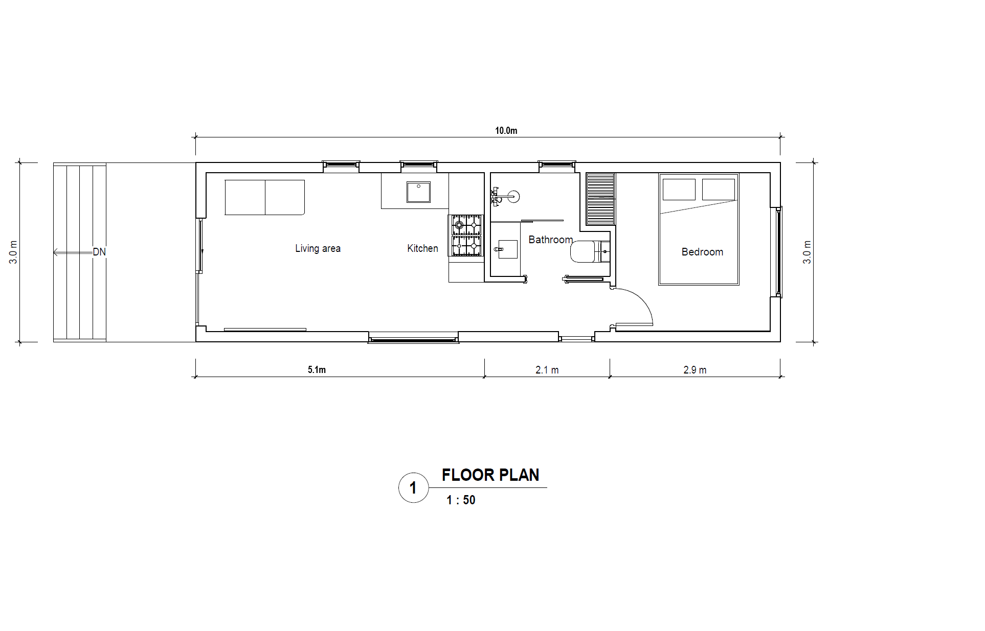 - 3.0 x 10.0 x 3.8m cabin with one bedroom and one bathroom.
